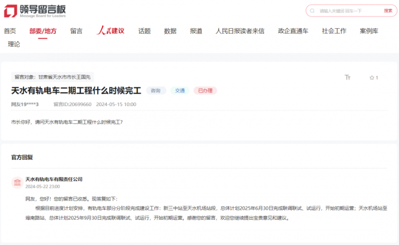 起头初期运营。总体打算2025年9月30日完成联调联试、试运转,起头初期运营;5月22日,天水有轨电车无限义务公司答复网友天水有轨电车二期工程什么时候落成?